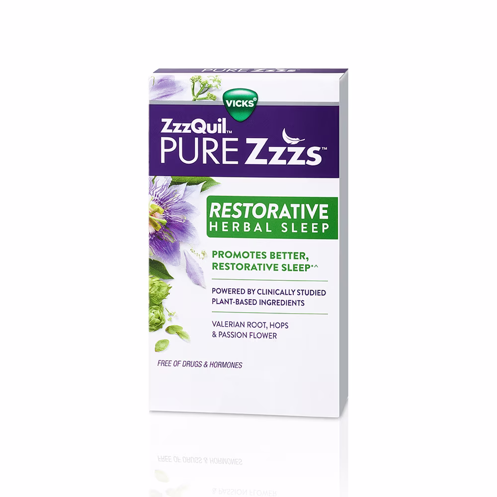 ZzzQuil PURE Zzzs Restorative Herbal Sleep is a melatonin free sleep aid made with a botanical blend that contains clinically studied and effective valerian root, hops and passion flower shown to help promote better, restorative sleep.*